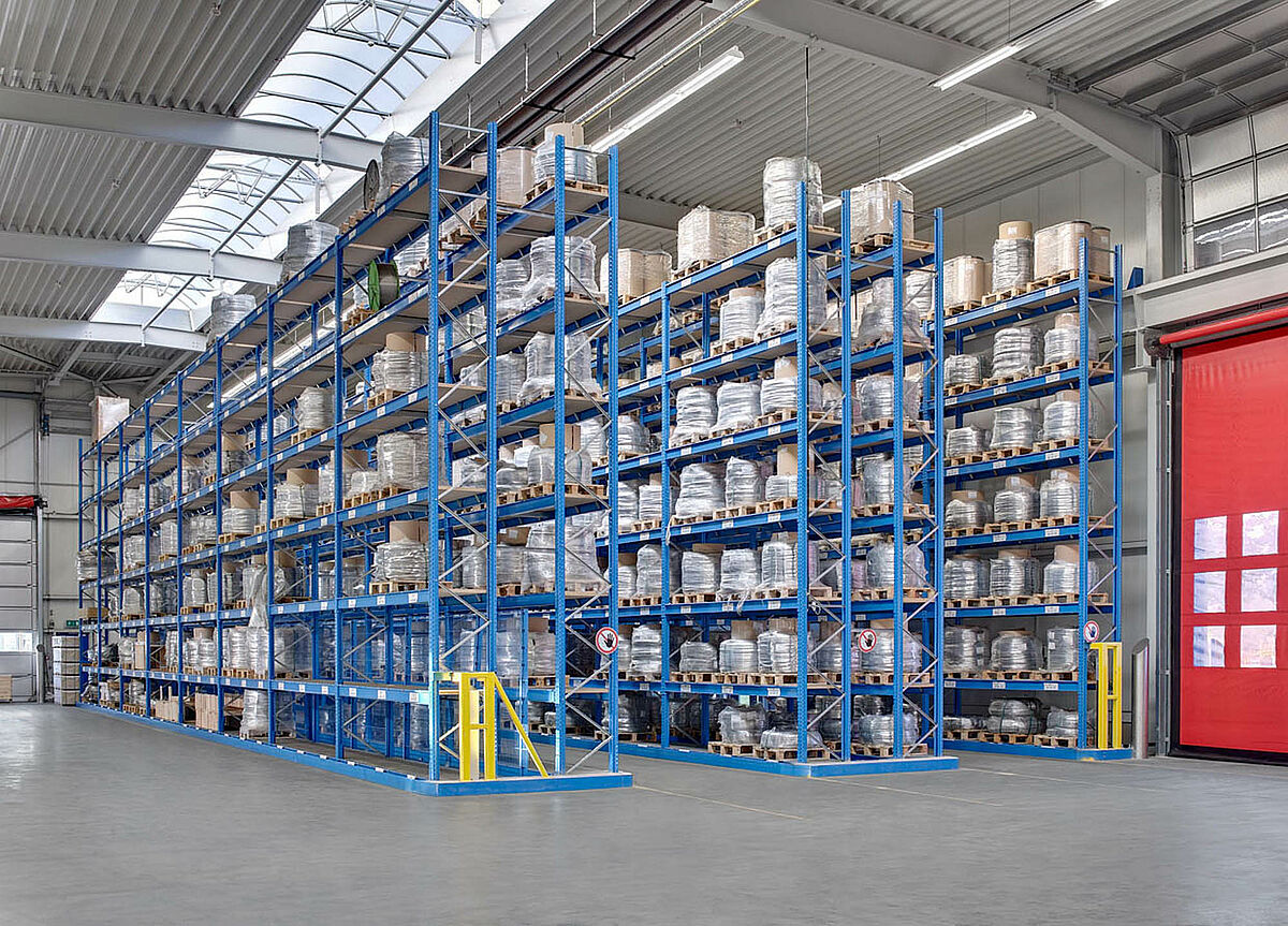 Klizna vodilica na nogama regala i upotreba Hubtex četverostranog viličara omogućili su širinu prolaza od samo 2,42 m koji je opet morao biti osiguran sustavima za osiguravanje prolaza, kako bi se izbjeglo susretanje osoba i viličara na ovim uskim prolazima.