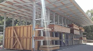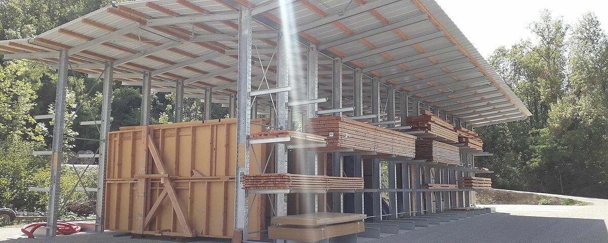 U tu svrhu OHRA je postavila dva reda konzolnih regala dužine 24 metra. I konzole i noge regala orijentirane su prema vani. Stalci regala visine 5,51 metara također nose 3,2 metra duge krovne krakove s obje strane. Regali su tako poredani da se između njih nalazi natkriveni, približno 6 metara široki podni skladišni prostor. Zahvaljujući nogama regala, koje su orijentirane su prema vani, skladište je prohodno. Ovdje se mogu skladištiti zidni elementi. Na vanjskim zidovima konzole dužine 1,2 metra s nosivošću od 800 kilograma čine tri (ili četiri s nogama regala) skladišne razine koje su također natkrivene. Ovdje se mogu skladištiti grede i konstrukcijsko drvo.