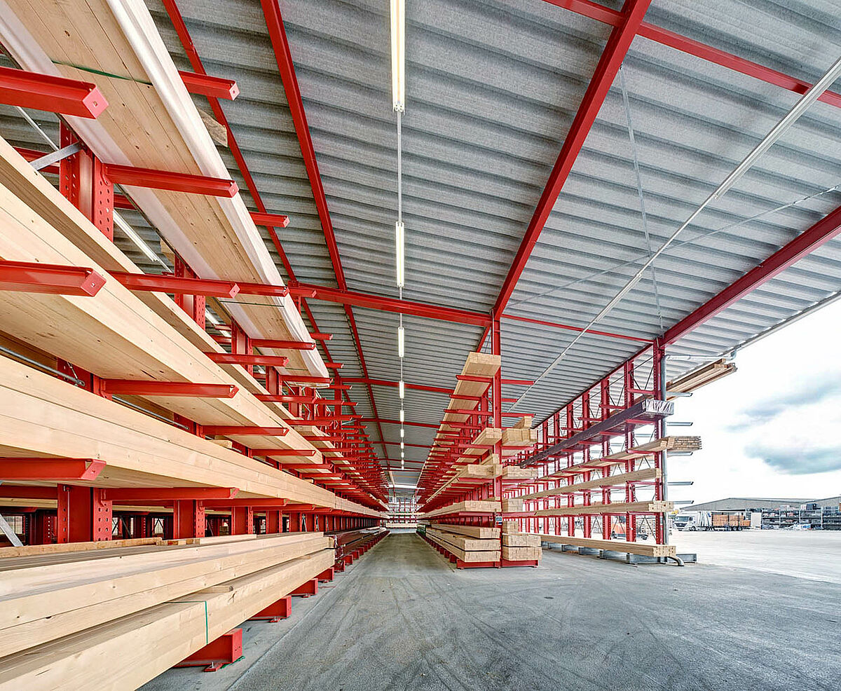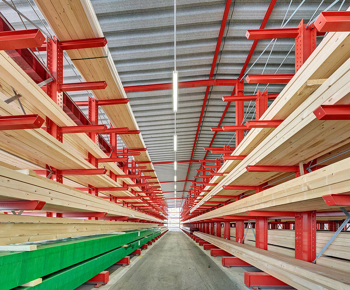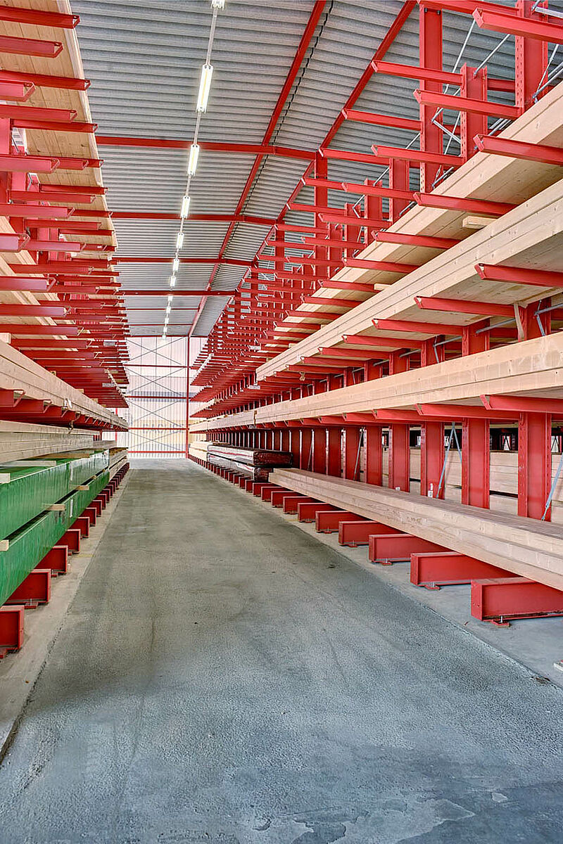 Dvostrani konzolni regali su na najvišem mjestu visoki 8.600 mm i nude 6 razina skladištenja na svakoj stranici regala. Pri nosivosti od 800 kg po konzoli mogu tako npr. u jednoj razini regala s 33 vješalice biti pospremljen materijal ukupne mase 26,4 t na jednoj razini skladišta. Zahtjevna ukupna površina za novo skladište drveta iznosi ca. 3.100 m². Visina vrha krova iznosi 9.750 mm. Time treba uzeti u obzir, da je za krovnu konstrukciju odabrana kombinacija od čeličnih i ljepljivih krovnih vezača Raspon potpornih ležajeva iznosi ca. 21.000 mm. Ovim vlastitim uspjehom je klijent mogao ovdje pri ovoj izvedbi uštediti novac.