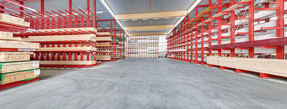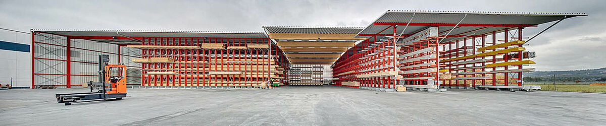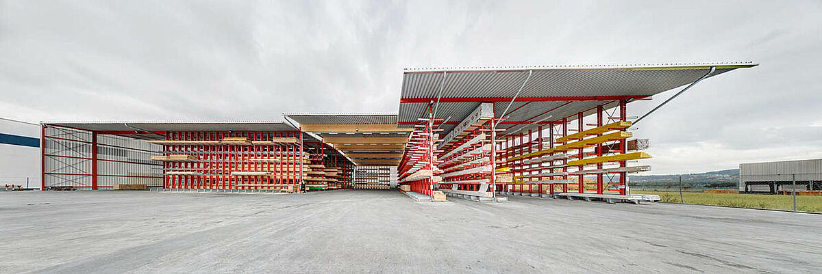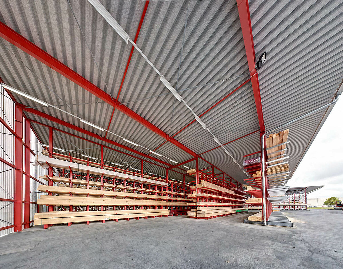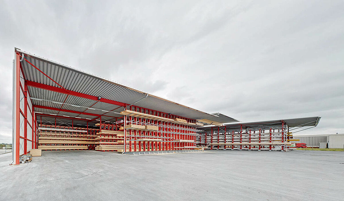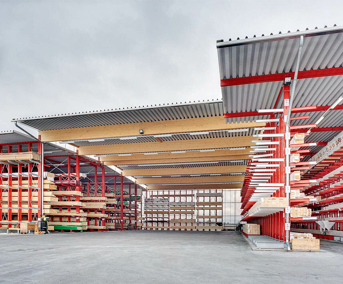 Dvostrani konzolni regali su na najvišem mjestu visoki 8.600 mm i nude 6 razina skladištenja na svakoj stranici regala. Pri nosivosti od 800 kg po konzoli mogu tako npr. u jednoj razini regala s 33 vješalice biti pospremljen materijal ukupne mase 26,4 t na jednoj razini skladišta. Zahtjevna ukupna površina za novo skladište drveta iznosi ca. 3.100 m². Visina vrha krova iznosi 9.750 mm. Time treba uzeti u obzir, da je za krovnu konstrukciju odabrana kombinacija od čeličnih i ljepljivih krovnih vezača Raspon potpornih ležajeva iznosi ca. 21.000 mm. Ovim vlastitim uspjehom je klijent mogao ovdje pri ovoj izvedbi uštediti novac.