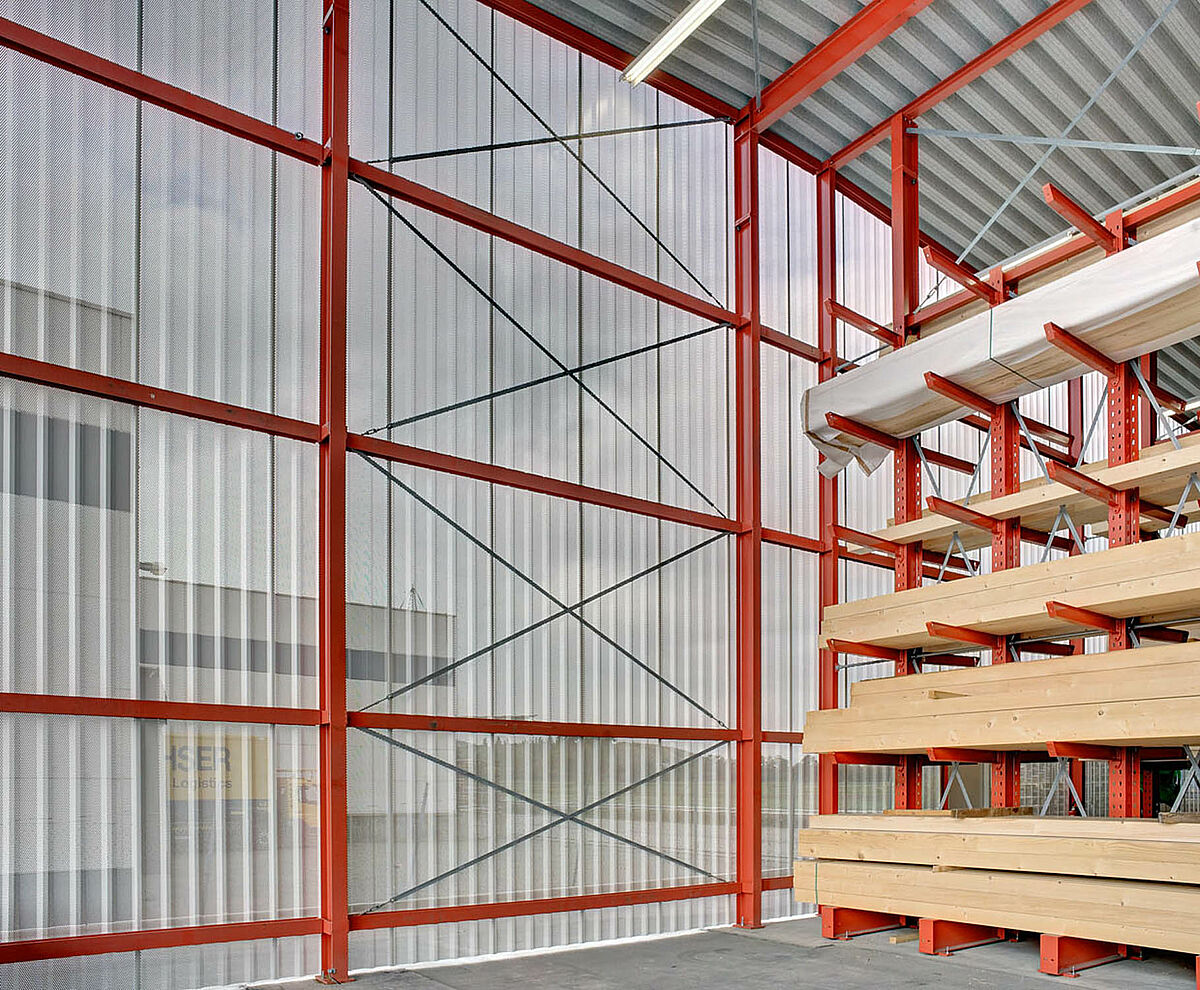 Podrazumijeva se da je cjelokupna čelična konstrukcija, prema želji klijenta premazana njihovom zaštitnom bojom RAL 3000. Dio nogu konzolnog regala dostavljen je u vruće pocinčanoj verziji, kako ni kod udara kiše ne bi došlo do hrđanja. Na kraju je uslijedila izvedba bočnih i stražnjih zidova konstrukcije regala s jednim trapezastim limom. Zahvaljujući posebnom rasporedu rupa je lim s jedne strane nepropustan za kišu i vjetar, a s druge strane propušta svjetlo i prozračan je.