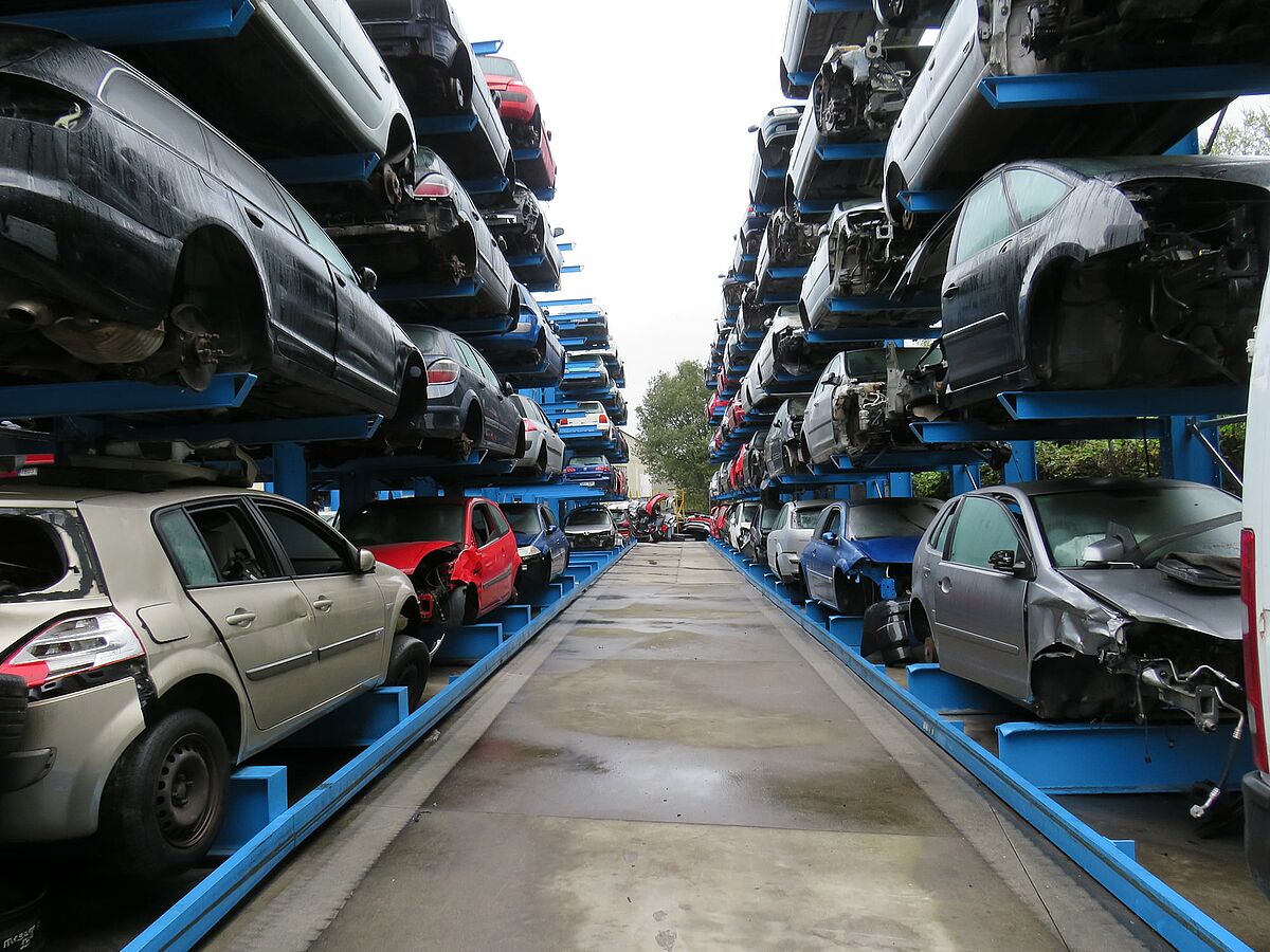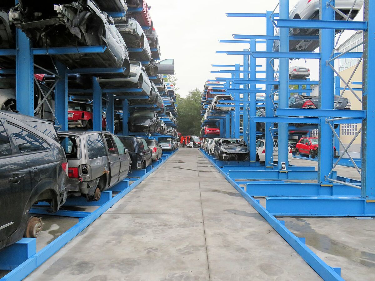 Za skladištenje kombi vozila tvrtka Desguace Auteco ugrađuje specijalne konzolne regale: Oni nude dvije razine skladištenja (uključujući baznu), pri čemu se gornja razina ugrađuje na visini od 2300 milimetara. Na taj se način lako mogu smjestiti i viša vozila. Krakovi konzole pričvršćeni s jedne strane nose svaki do 1200 kilograma, što znači da ovdje pohranjena stara vozila mogu težiti do 2,4 tone.