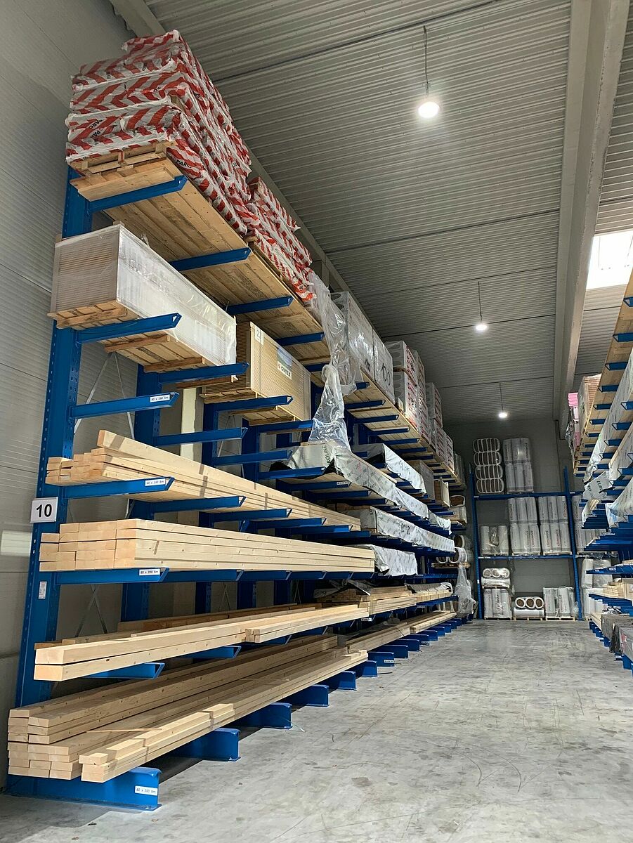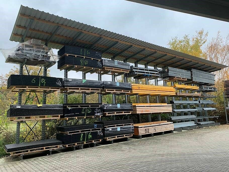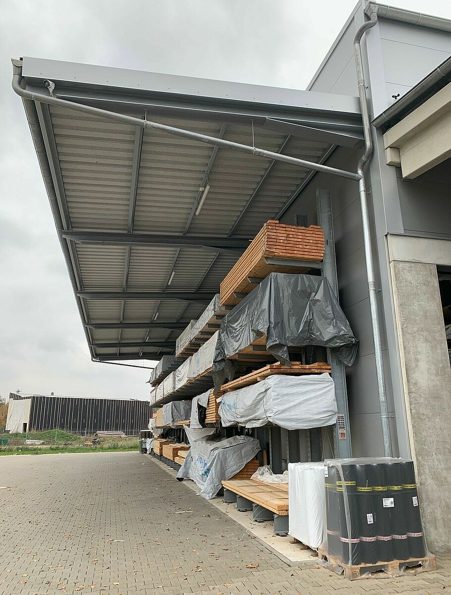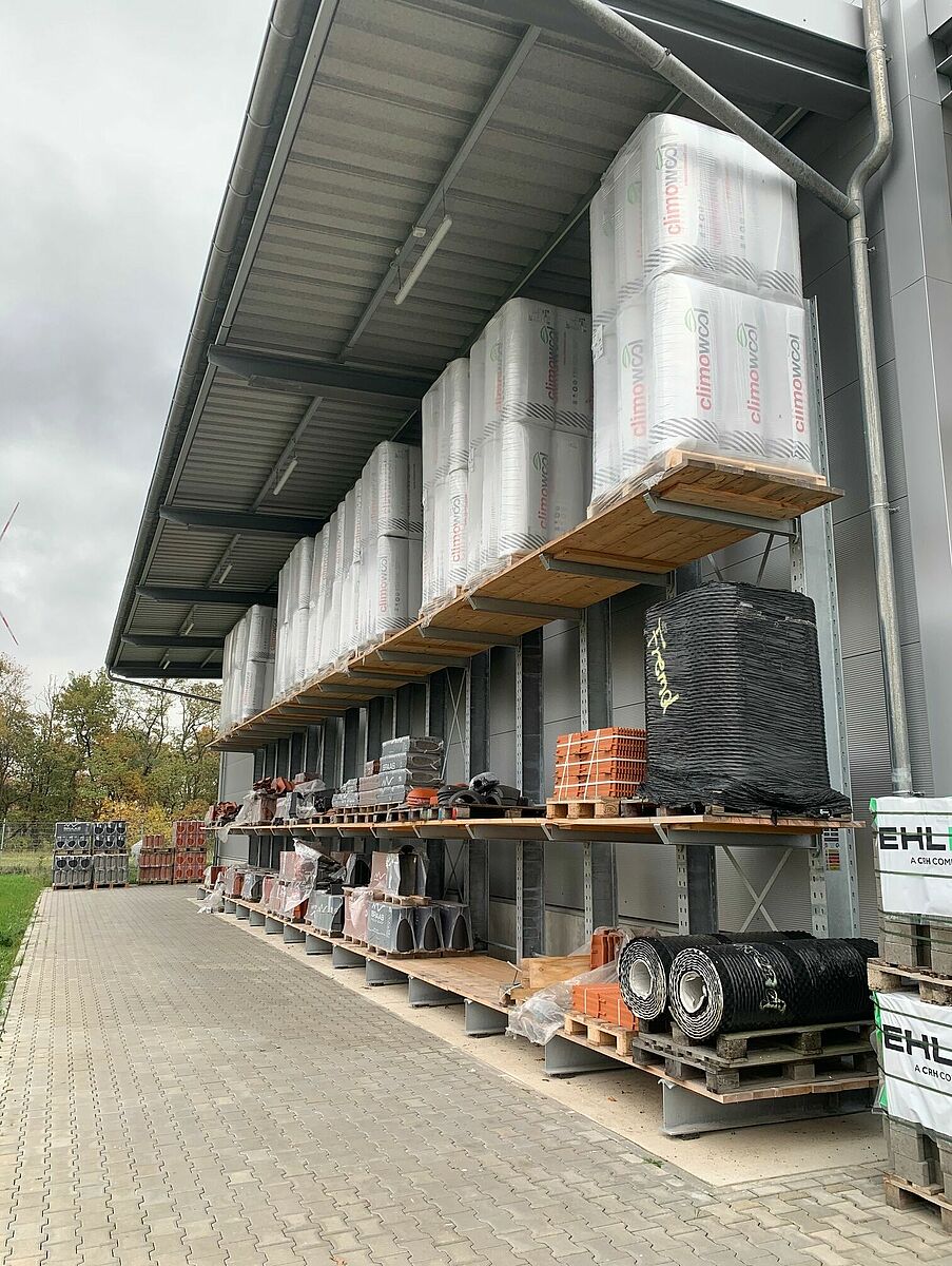 Novoizgrađena, 12 metara visoka skladišna hala nalazi se na površini od 1000 četvornih metara i nudi dodatni prostor za nove artikle kao što su fasadne ploče, izolacijske ploče ili čvrsta konstrukcijska građa. Mnogi artikli, koji su sada udobno i sigurno pohranjeni na regalima, prethodno su bili pohranjeni na otvorenom i na podu. S paletnim regalima visokima do 6,58 metara i konzolnim regalima visokima oko 7 metara, kapacitet skladištenja i pristup robi mogao je biti značajno poboljšan. Tvrtka OHRA ukupno je postavila četiri reda regala duljine oko 18 metara, koji se sastoje od paletnih i konzolnih regala, kao i dva konzolna regala duljine 25,5 metara sa šest razina skladištenja postavljenih uzduž unutarnjih zidova hale. Dodatni konzolni regali u vanjskom području pružaju prostor za manje osjetljive građevinske materijale.