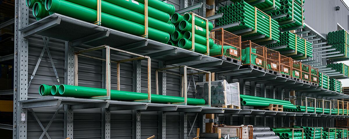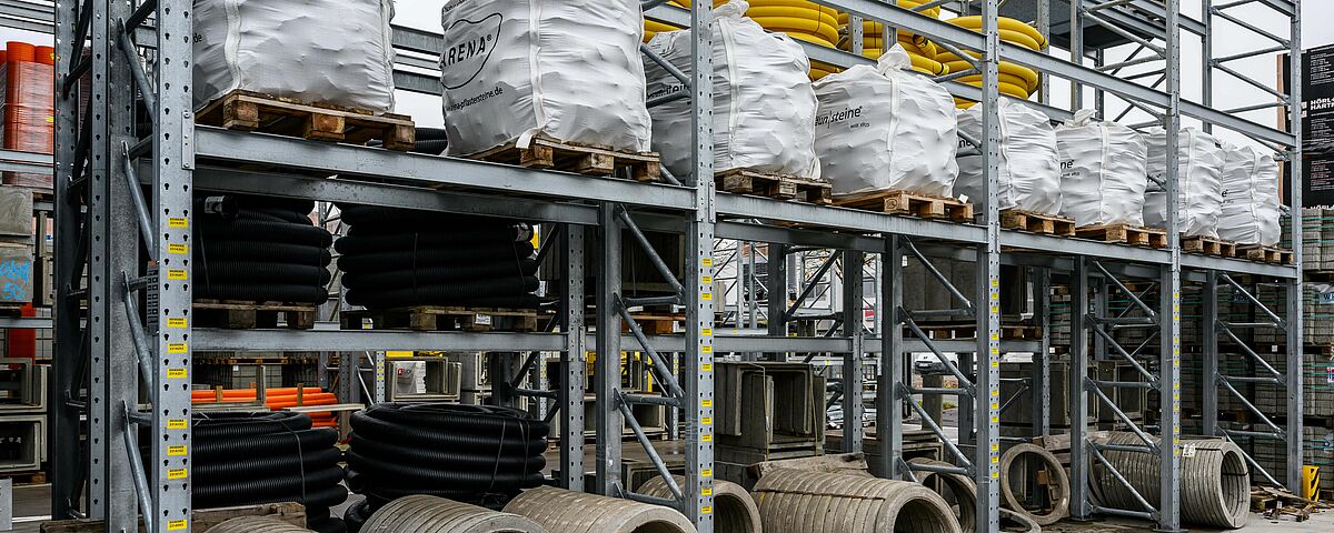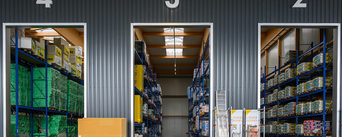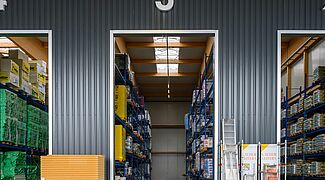 Zbog različitih materijala OHRA je skladišne prostore opremila i konzolnim i paletnim regalima. Postavljena su ukupno 22 regala, jednostruke i dvostruke dubine i visine do 7.500 milimetara. Svaki regal konfiguriran je pojedinačno za različitu robu u smislu nosivosti, broja razina skladištenja i pribora. Dok su unutarnji regali lakirani u boju po želji, vanjski regali su pocinčani i na taj način zaštićeni od vremenskih utjecaja. Neki regali su opremljeni dodatnim nosačima ili rešetkama kako bi bili što fleksibilniji pri skladištenju artikala različitih dimenzija. Također, posebnost je krajnji regal u hali: Izrađen je tako da može primiti zaštitnu ogradu između osovina – stoga služi kao stražnji zid zgrade.