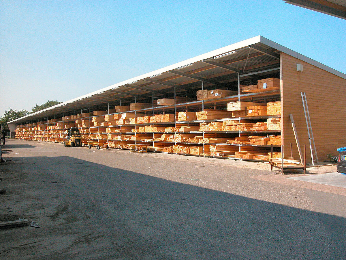 Das dortige, noch selbst gebaute Holzlager im Außenbereich stieß mit seinen zwei Lagerebenen allerdings an seine Grenzen. Denn auch die Kunden von Gooskens rationalisieren ihre Prozesse und minimieren die Lagerbestände. Entsprechend mehr Kapazitäten sind bei dem Holzlieferanten gefordert, um eine schnelle und sichere Belieferung zu gewährleisten. Gooskens entschied sich daher, ein neues Lager zu bauen. Die Besonderheit dabei: Das Lager sollte als Wabenregal ausgeführt werden, das heißt, die Holzbalken und -latten werden längs in die 6.500 Millimeter tiefen Fächer „gesteckt“. Das ermöglicht einen besseren Überblick über die eingelagerten Profilarten und eine schnelle Kommissionierung per Hand.