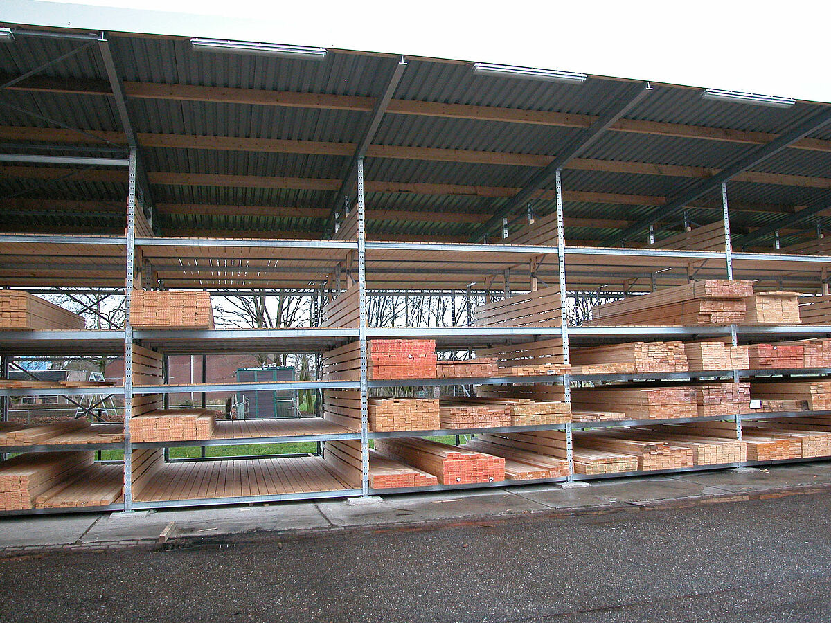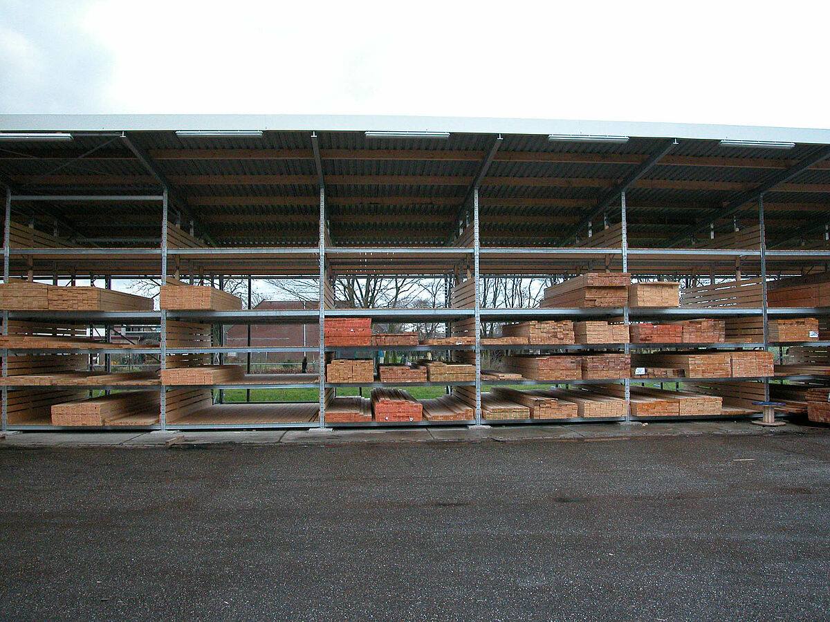 Das neue Lager wurde von OHRA realisiert. Das in Kerpen, Deutschland, ansässige Unternehmen hat sich auf Regallösungen für den Baustoff- und Holzhandel spezialisiert. Bei Gooskens kam das Palettenregalsystem von OHRA zum Einsatz. Um die erforderliche Lagertiefe zu erzielen, haben die Experten von OHRA mehrere Rahmen des Regalsystems hintereinander gesetzt und mit Holzböden versehen. Die Rahmen sind aus warmgewalzten Stahlprofilen gefertigt, die bei Kollisionen elastisch nachgeben und auch dann noch ihre hohe vertikale Belastbarkeit beibehalten. Ein Dach auf der Konstruktion schützt das eingelagerte Holz vor der Witterung und macht das Regallager zu einem eigenständigen Gebäude. Insgesamt hat das neue Lager eine Höhe von 6 Metern und eine Länge von 120 Metern. Die fünf Lagerebenen haben eine Tragfähigkeit von jeweils 2.800 Kilogramm.