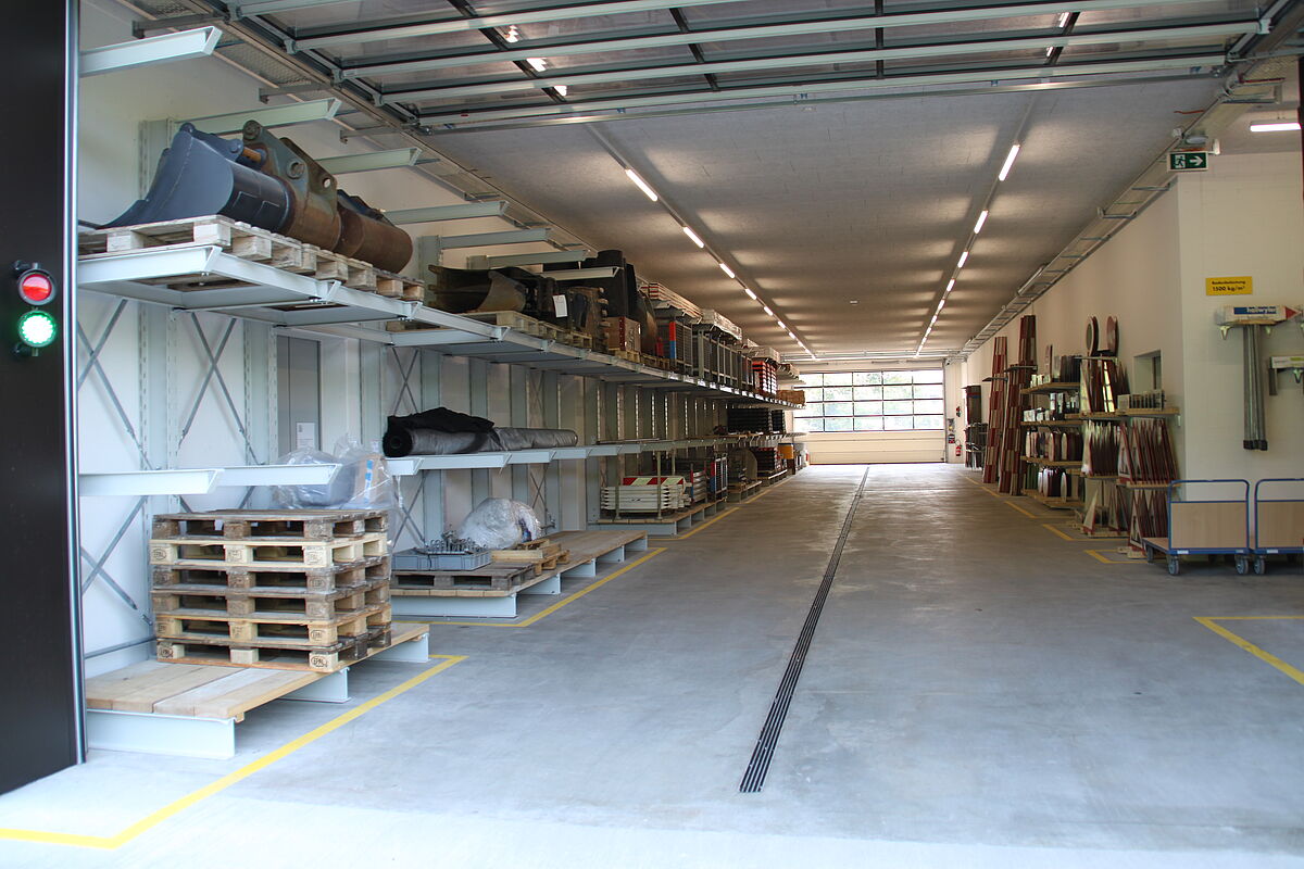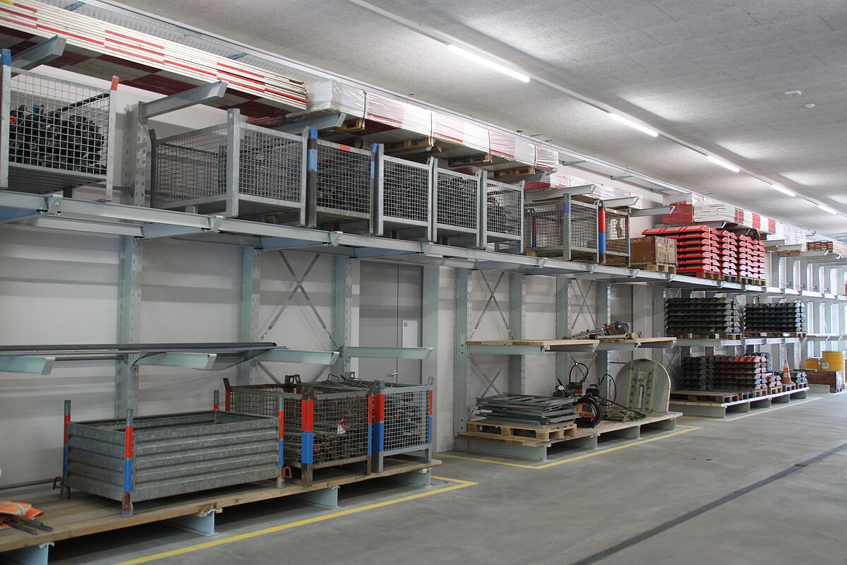Industrijsko dvorište tvrtke Gottlieb Müller u Rothristu od početka 2018. godine služi kao operativna platforma za projekte visokogradnje i dubokih iskopa. Kako bi se raznoliki građevinski materijali i zalihe mogle učinkovito skladištiti, tvrtka Gottlieb Müller odlučila je upotrebljavati dvije vrste regala: Skladišna hala u suštini je opremljena paletnim regalima visokim 16,5 metara i dugačkim 8,45 metara. Svaki pretinac regala sadrži tri euro palete ili rešetkaste kutije mase do 1000 kilograma. Dodatni skladišni prostor u hali osigurava 3,64 metara visoki, jednostrani konzolni regal. Neki od njih raspolažu mostovima za krakove i podnim policama, tako da se osim dugačkih komada robe, kao što su cijevi ili ploče, mogu skladištiti pomoćna sredstva za utovar različitih dimenzija bez ometajućih stupova. Više konzolnih regala postavljeno je na otvorenom; njih od korozije štiti vruće pocinčani sloj. Ovdje ispred svega dominira red polica dugih 43,5 metara, čiji su najviši konzolni elementi izvedeni kao krovne ruke: Na svakoj strani je 2,7 metara dubok, blago nagnuti krov. Tako su uskladišteni drveni građevinski materijali zaštićeni od izravnog utjecaja oborina. Konzolni krakovi svakog regala imaju nosivost od 1200 kilograma po kraku.