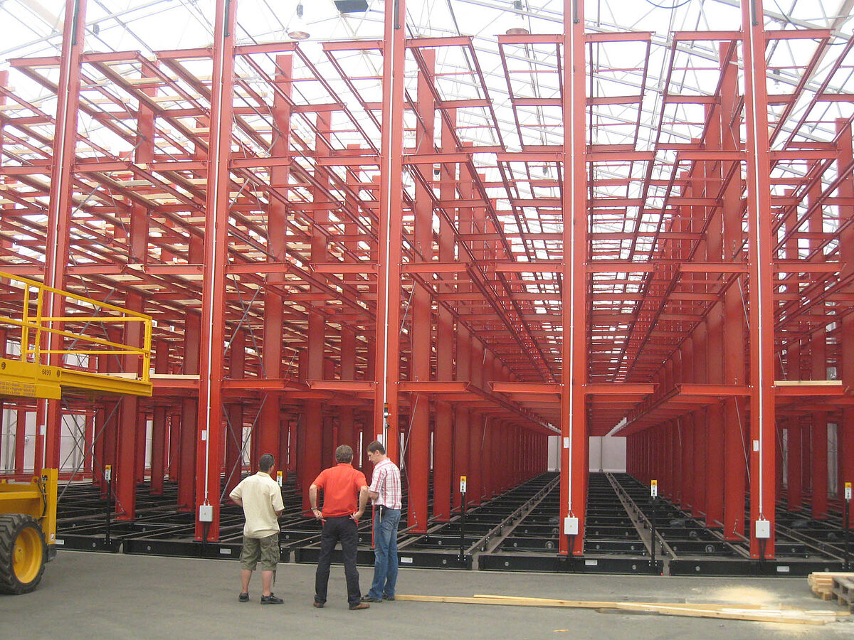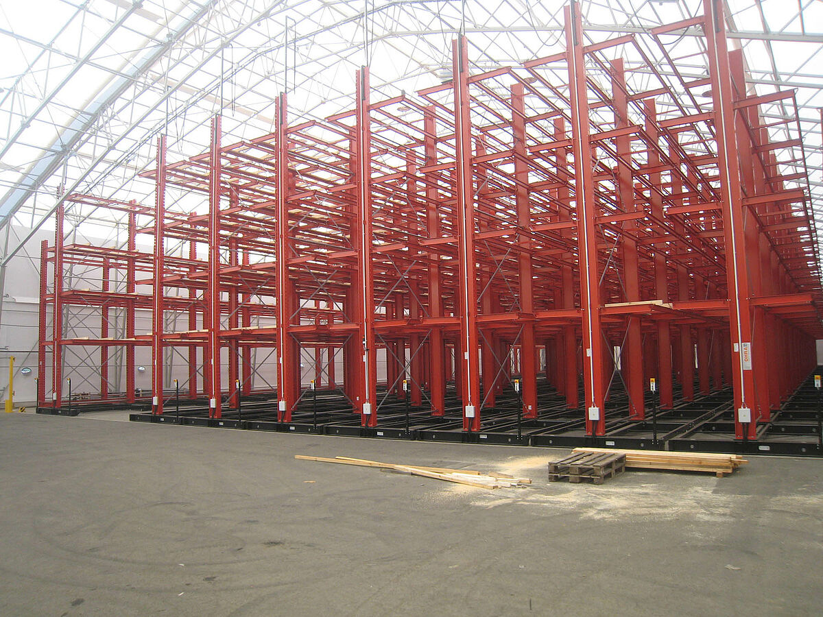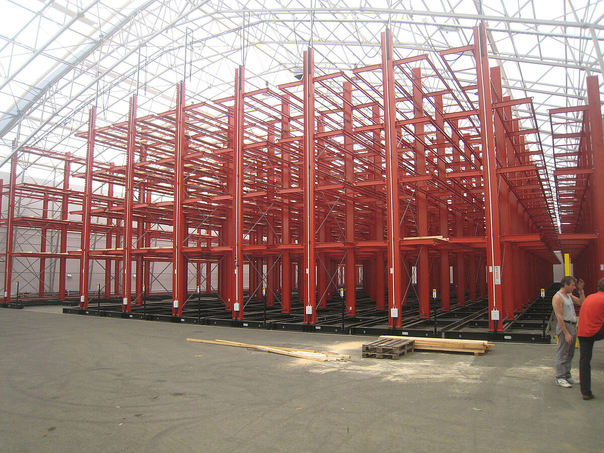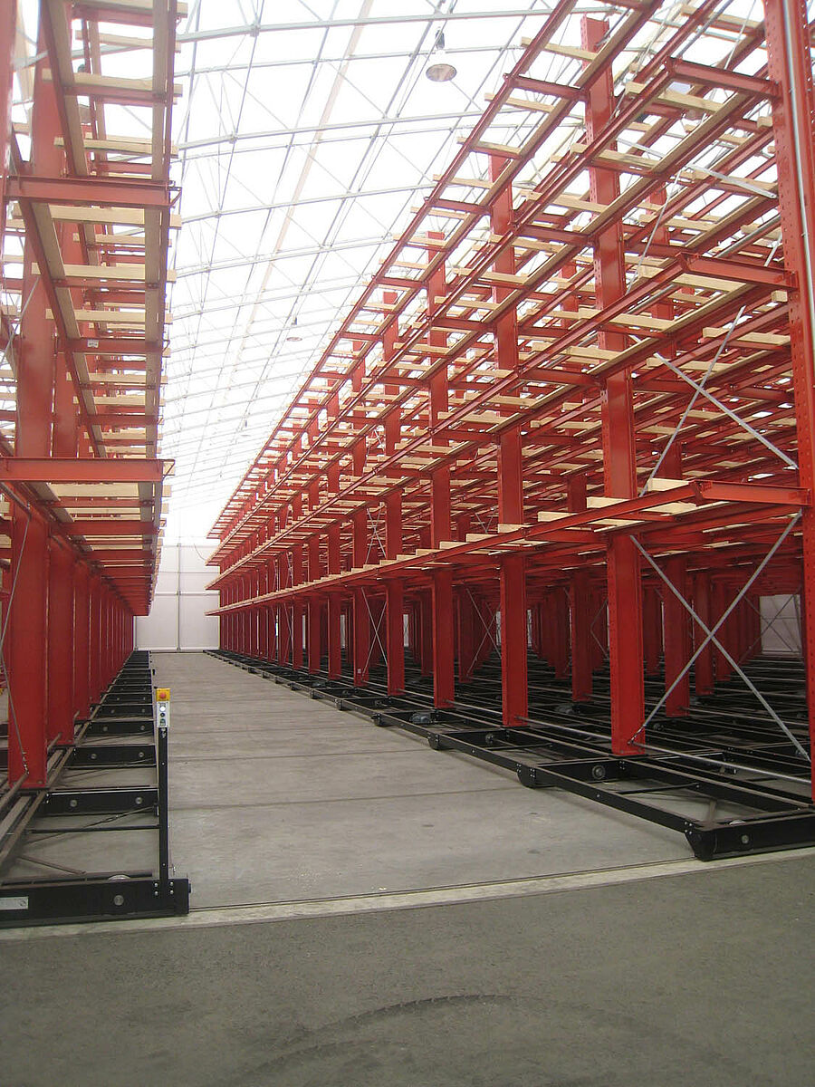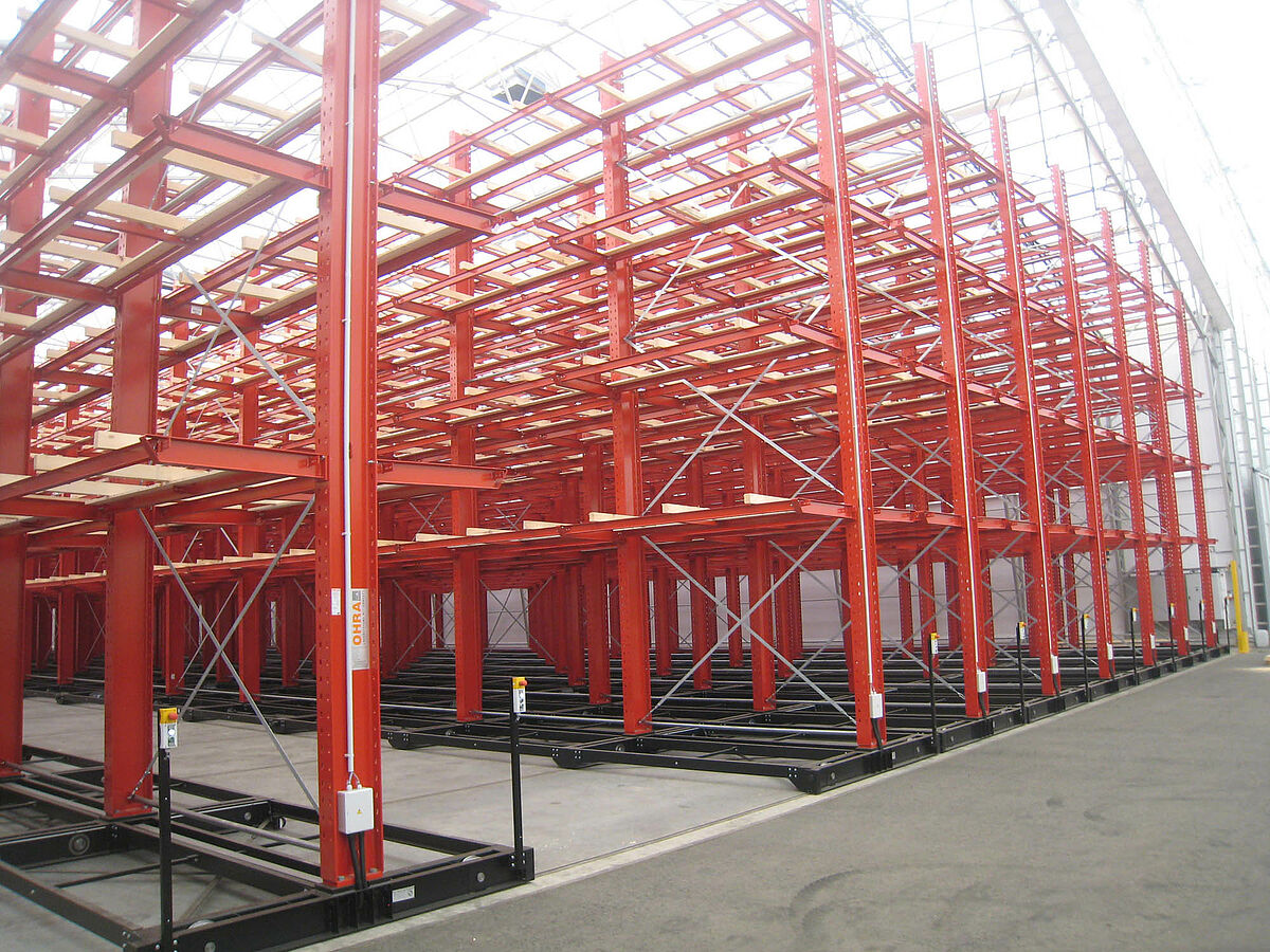 OHRA übernahm den Aufbau der kompletten Regalanlage. Dazu gehörte auch die Montage der für die Verfahrwagen benötigten Schienen, die noch vor dem Bau der eigentlichen Halle im Freien stattfand. Von den insgesamt zehn 60 Meter langen und mit vier bis fünf Ebenen bis zu 9,2 Meter hohen Kragarmregalen wurden zwei fest im Boden verschraubt. Die restlichen acht wurden auf 58 Meter langen Verfahrwagen von OHRA montiert. Die Verfahrwagen werden elektrisch angetrieben und lassen sich über eine Fernsteuerung vom Stapler aus auseinanderfahren. Nur die gewünschte Gasse öffnet sich – so wird die Lagerkapazität auf einer vorhandenen Fläche nahezu verdoppelt.