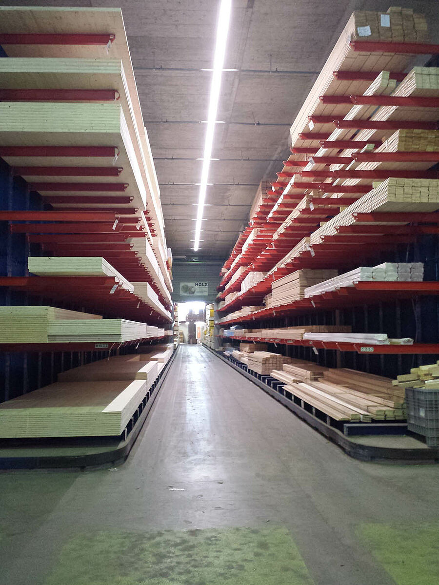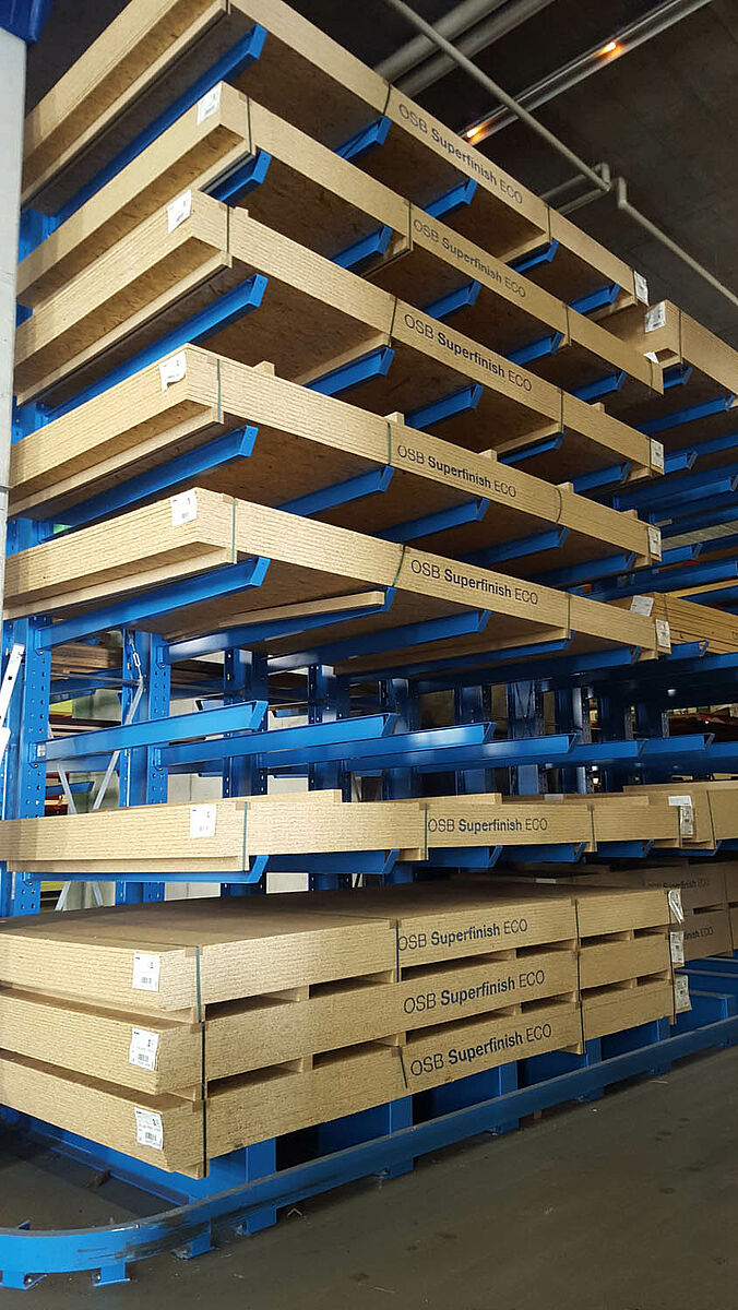 Budući da bi skladište trebalo pružati prostor za različite vrste ploča – masivnih drvenih ploča, OSB ploča, ploča iverica, šperploča, MFP ploča i osjetljivih furniranih ploča iverica – višefunkcionalan skladišni regal bio je prijeko potreban. Gfeller je iz tog razloga proširio postojeće skladište s konzolnim regalima tvrtke OHRA: tvrtka sa sjedištem u Kerpenu, Njemačka, europski je tržišni lider za konzolne regale. Svi strukturni elementi njihovih regala izrađeni su od čvrstog vruće valjanog čelika. Stabilna i tanka konstrukcija omogućuje visoke visine skladištenja, a time i bolju iskoristivost prostora. Tvrtka Gfeller postavila je u svojem skladištu stupove visoke preko 7 metara uz pomoć kojih je ostvareno skladištenje na devet razina.
