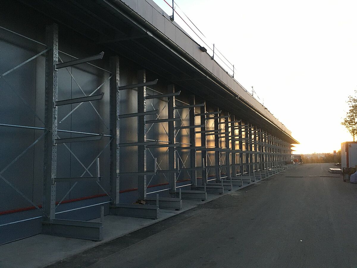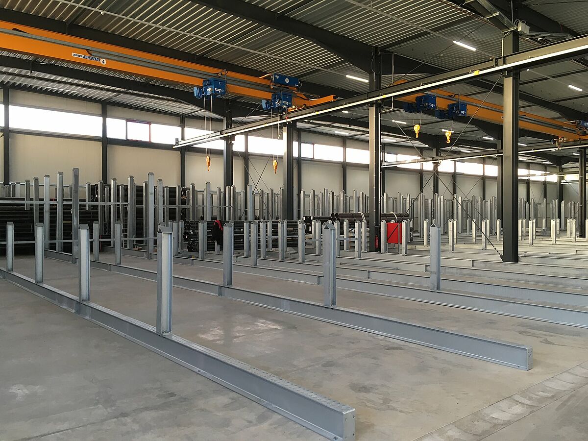 Dok teške i duge cijevi, odnosno snopovi cijevi, svoje mjesto nalaze u regalima za okomitu pohranu, lagane cijevi se skladište na konzolnim regalima tvrtke OHRA. Otprilike 5 metara visoki pocinčani regali postavljaju se s jedne strane na unutarnjim stijenama hale, a s druge strane oko vanjskih stijena. Utični klinovi i rukavci na krajevima 1,4 metara dugačkog kraka s nosivošću do 640 kilograma osiguravaju sigurno skladištenje cijevi.