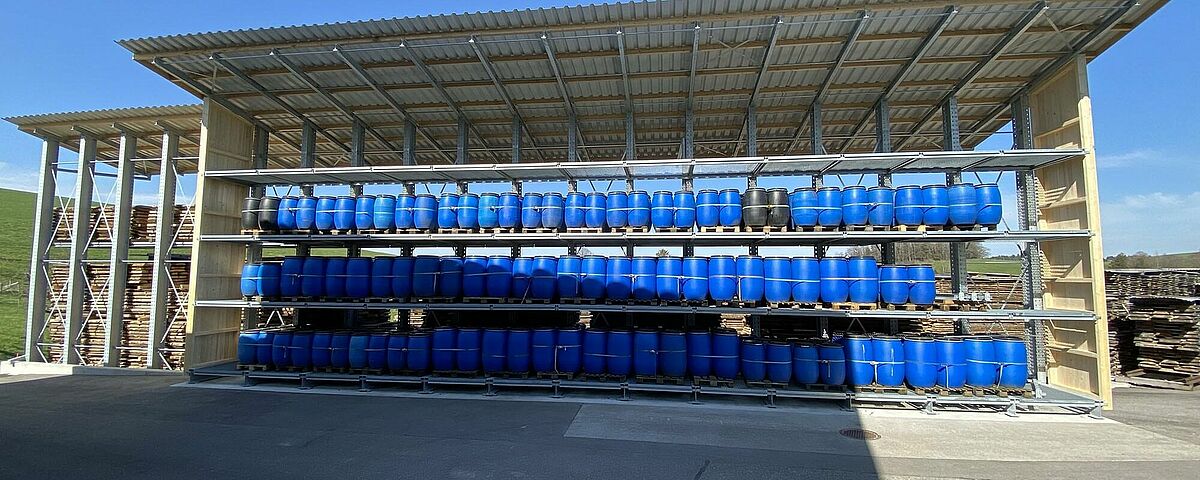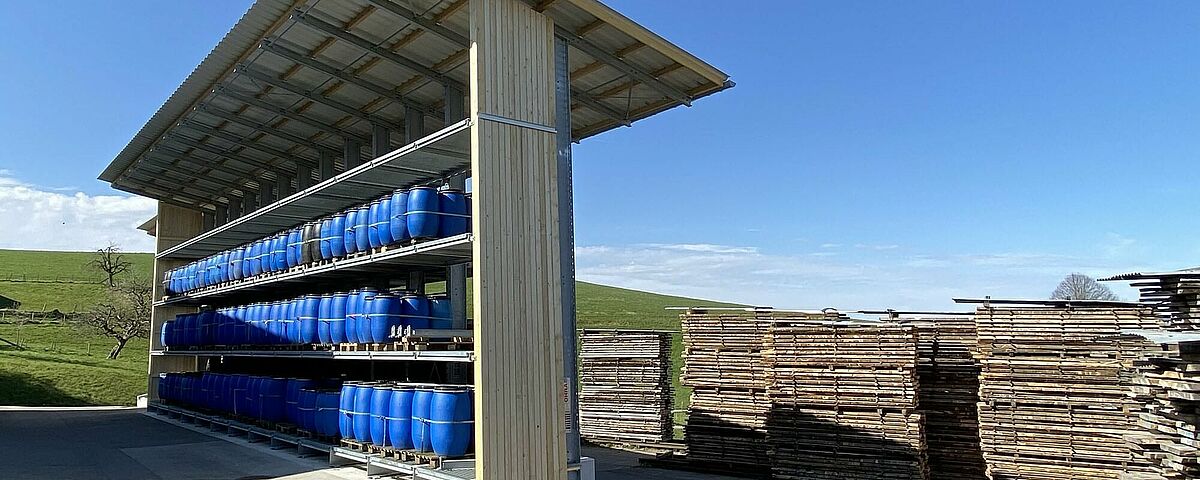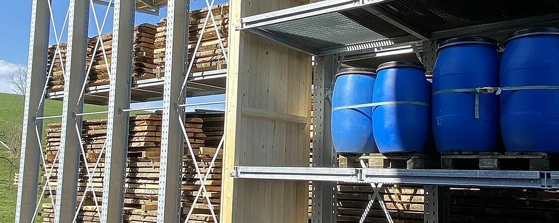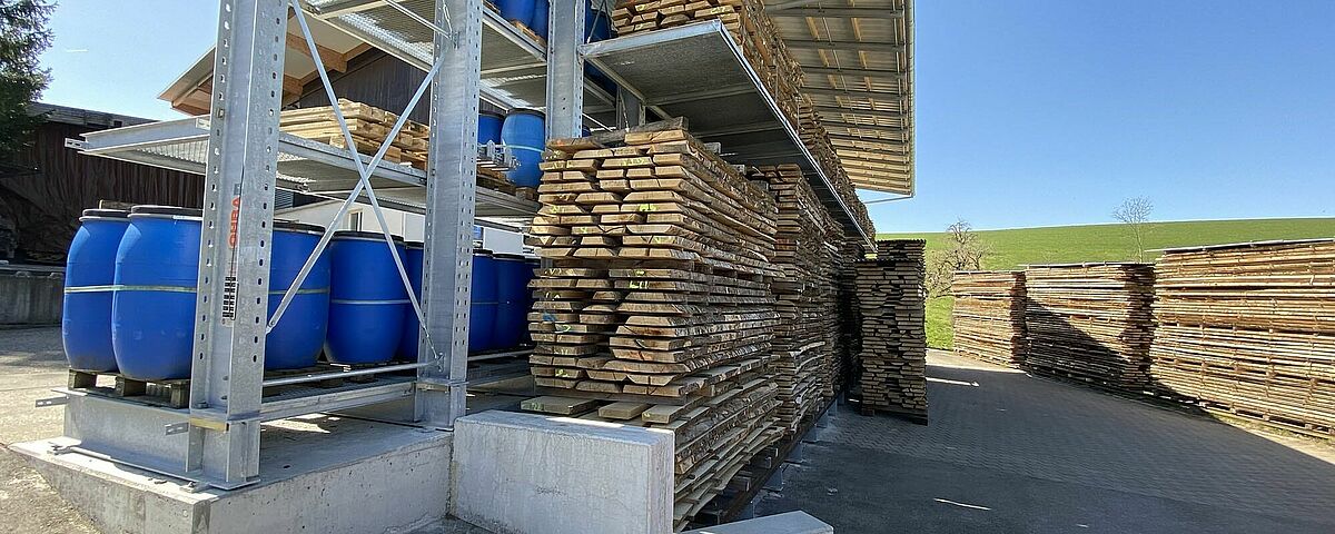 Do nedavno je Nyfeler skladištio ploče od bukovih blokova, koje, između ostalog, stolarska radionica koristi za proizvodnju mramornog sustava CUBORO, kao i drva za ogrjev i ostale predmete na otvorenom. No, euro palete korištene u procesu neprestano su propadale, što je dovelo do opasno iskrivljenih gomila. Da bi se moglo doći do robe, predmeti su se morali ponovno nezgrapno spakirati. Da bi ih zaštitio od vremenskih nepogoda, Nyfeler je također svaku gomilu prekrivao ceradama - što je podrazumijevalo puno dodatnog napora u pogledu rukovanja. Te na kraju je skladište zauzimalo ogromno područje.