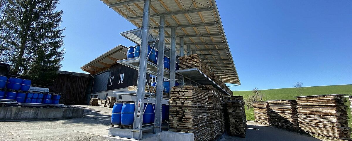 Tereni s velikim nagibom i uski prostorni uvjeti postavili su posebne izazove za planiranje novog vanjskog sustava regala za stolarsku radionicu Nyfeler Holzwaren AG. OHRA je konačno podijelila dvostrani konzolni regal na istočnu i zapadnu stranu, koje su zaštićene zajedničkim krovom dubokim šest metara, unatoč raznim visinama poda i stupnjevitoj strukturi. Nyfeler dobiva znatno više prostora za skladištenje s regalom, štedi vrijeme tijekom skladištenja i dohvaćanja i trpi manje štete na uskladištenoj robi zahvaljujući zaštiti od izravnih vremenskih utjecaja.