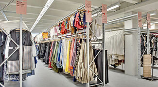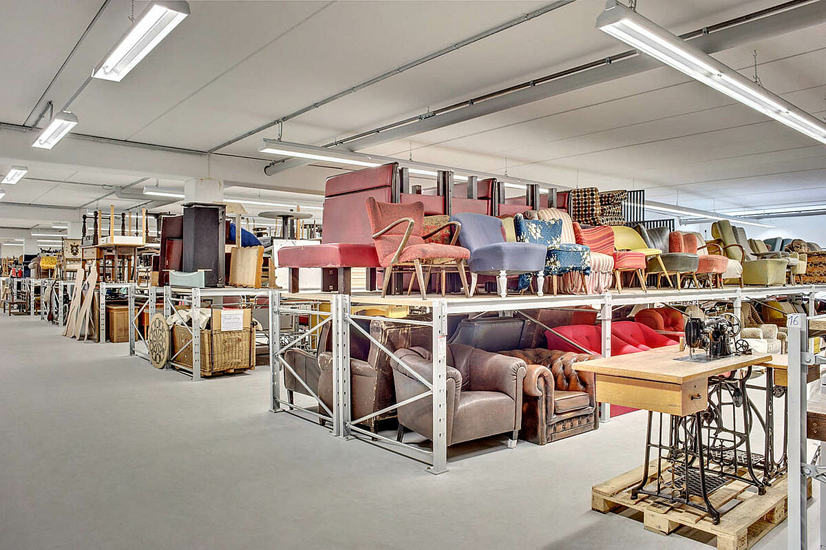 Trokatna hala, koja graniči u međuprostoru, rezervirana je za ostale rekvizite kao što su namještaj, lampe, dekorativni predmeti itd. Cijela jedna etaža rezervirana je za kostime, cipele i modne dodatke. Nikakvo čudo, jer samo kostimi vise tik jedan uz drugog na oko 2.400 dužnih metara. Regali za odjeću. Pored toga dolaze još i regali za cipele, šešire i ostale dijelove opreme.