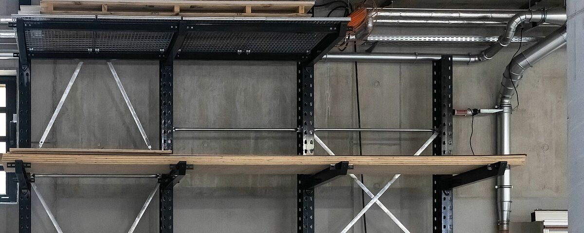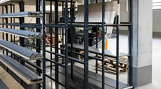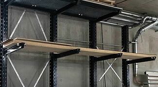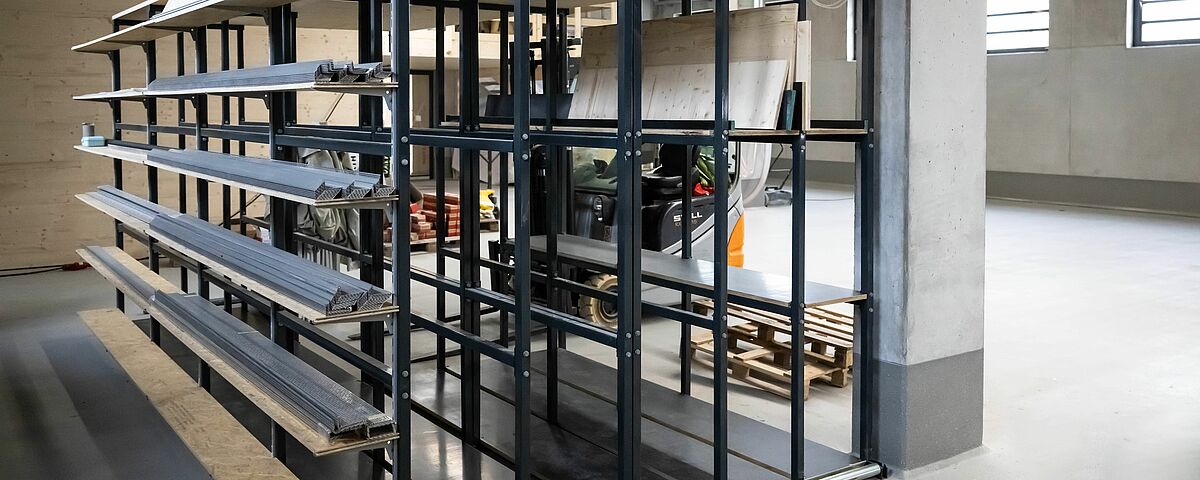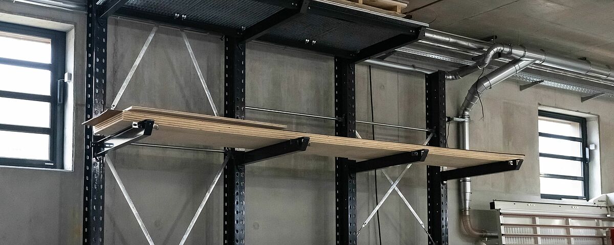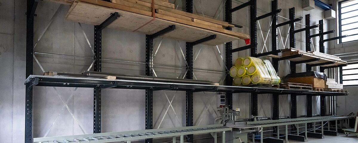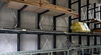 Sustav regala projektiran za novo skladište sastoji se od skoro 16 metara dugog vruće pocinčanog konzolnog regala na otvorenom. Unutra se nalazi jedan konzolni regal duljine 15 metara i jedan duljine tri metra. Konzolni regali visine oko sedam metara nude znatno veći skladišni kapacitet u usporedbi s podnim skladištem i znatno nižim konzolnim regalima koji su se koristili na staroj lokaciji. Konzolni krakovi regala, koji mogu nositi do 1.000 kilograma, također su djelomično opremljeni rešetkastim podovima i mostovima za krakove. To znači da se na njima mogu skladištiti vrlo različite vrste drva, konsignacijskih artikala i paleta. Osim toga, zahvaljujući slobodno ovješenim konzolnim krakovima, visine pojedinačnih skladišnih razina mogu se vrlo fleksibilno podešavati. Za skladištenje ploča različitih veličina ugrađena su dva dodatna vertikalna regala u kojima se ploče spremaju okomito – to omogućuje brz i jednostavan pristup željenom artiklu. Na zahtjev tvrtke Ihre Zimmerei sve su unutarnje police plastificirane u atraktivnu antracit sivu boju (RAL 7016).